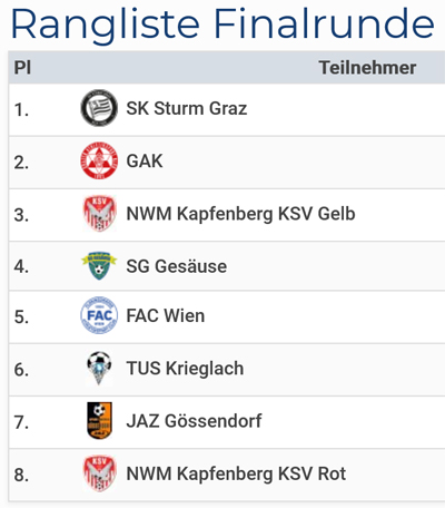 Im Finale kam es zum Grazer Stadtderby Sturm vs. GAK. Nach spannenden 12 Spielminuten stand es 0:0 Unentschieden und die Entscheidung musste im 7-Meterschießen fallen. Den entscheidenden Penalty zu 3:3 Ausgleich konnte der unglückliche GAK-Spieler im 2. Anlauf nicht verwandeln und somit war Sturm Graz mit 3:2 Turniersieger der U11!
