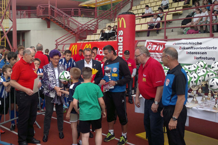 Wie alle Jahre ging es trotz des Wettkampfs am Fußballplatz in erster Linie um das Miteinander der jungen Sportler. So fanden auch die Side-Events großen Andrang. Am beliebtesten waren einmal mehr die Trike-Biker, die die Schüler auf ihren heißen Öfen für kurze, aber umso lautere Fahrten mitnahmen. |