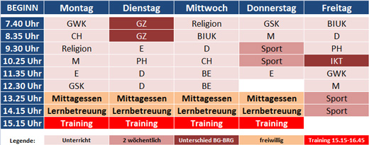Wochenplanung Die Zeitplanung anhand einer 4. Klasse BRG Kapfenberg veranschaulicht den Ablauf einer Schulwoche:Die Mittagsbetreuung erfolgt indiviudell am jeweiligen Schulstandort:> 13.25 – 14.15 Uhr Mittagessen> 14.15 – 15.00 Uhr Lernbetreuung> 15.00 – 16.30 Uhr Training