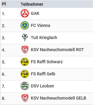In der Gruppe DSIRE hatte der GAK ebenfalls mit 3 Siegen und einem TV von 9:0 die Nase vorne. Das Team KSV Nachwuchsmodell GELB wurde in dieser Gruppe Vierter. Allerdings nur mit zwei knappen 0:1 Niederlagen und einem 0:4 gegen die starken GAKler.