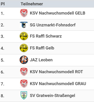 Das KSV Nachwuchsmodell-Team ROT gewann seine Vorrundengruppe knapp mit 2 Siegen, 1 Remis und einem Torverhältnis von 3:1. Für KSV GELB lief es nicht so berauschend und so mussten sie sich mit dem 4. Gruppenplatz begnügen. Im Viertelfinale trafen somit die beiden Kapfenberger Teams im internen Duell aufeinander. Dieses Spiel um das obere Playoff konnte das Team Rot klar mit 3:0 für sich entscheiden. Nach 2 weiteren, jedesmal knappen 0:1 Niederlagen, wo auch Siege möglich gewesen wären, blieb für das Team Gelb nur der 8. Endrang.