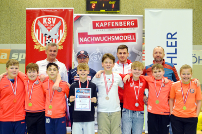 1. Platz KSV Nachwuchsmodell GELB vorne v. li.: Joel Moldovan, Oskar Edlinger, Lukas Lenes, Florian Bauer hinten v. li.: Toni Milicevic, Aydin Skalic, Niklas Hödl, Philip Kernegger / Trainerteam Asmir Omerovic, Mario Bauer