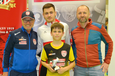2. Platz KSV Nachwuchsmodell ROT Vorne v.l.: Leon Mellitzer, Marvin Stranegger, Stefan Moldovan, David Tadijic, TW Levi Kucharek Hinten v.l.: Sebastian Winkler, Leo Pusker, Armend Noka, Jakob Lammer, Gianluca Albu / Trainerteam Valentin Shtufaj, Denis Boboi