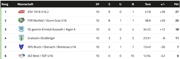 Mit einem klaren 6:0 Heimerfolg über Gratwein-Straßengel im letzten Spiel zur Qualifikation für die Steirische Leistungsklasse Landesliga U16 sicherten sich die Kapfenberger den Herbstmeistertitel der Quali-Gruppe B!