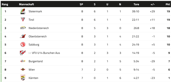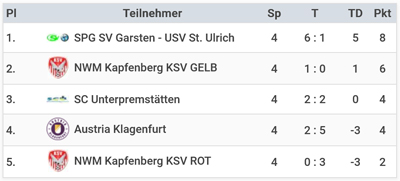U12: Am Samstag siegte die Spielgemeinschaft SV Garsten/St. Ulrich aus Oberösterreich knapp vor KSV Nachwuchsmodell Gelb und dem SC Unterpremstätten auf Platz 3, Austria Klagenfurt landete punktegleich auf Platz 4. Das Team Nachwuchsmodell Rot wurde Fünfter.
