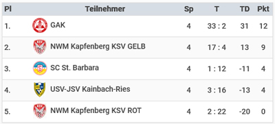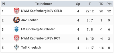 U11: Am Sonntag vormittag siegte das Heimteam NWM Kapfenberg KSV Gelb klar mit 12 Punkten und 22:2 Toren vor dem JAZ Leoben. Dritter wurde der FC Kindberg-Mürzhofen. Torschützenkönig wurde Milicevic Toni vom KSV Nachwuchsmodell mit 8 Toren.