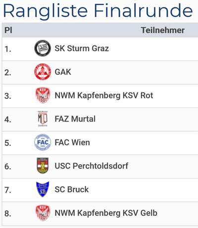 Aufgrund des Turniermodus (Direkter Vergleich vor Torverhältnis) waren die KSVler somit Turniersieger und die knappe Niederlage trotz rollender Kapfenberg-Angriffe gegen das JAZ Leoben im letzten Spiel ohne Einfluss. Gratulation den Turniersiegern!