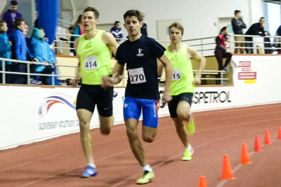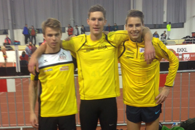 Bildinfo: Christoph Teubl und Sebastian Gaugl beim 500m Lauf / die drei Läufer in der Halle in Bratislava
