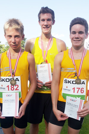 Rang 3 gab es für die Burschen über 3x100m U18. Florian Ebner, Timmy Mund und Sebastian Gaugl liefen 8.58,79 und sicherten sich die Bronzemedaille. |
